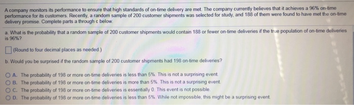 Enter those numbers into our on-time delivery calculator to find your rate. This problem has been solved. To calculate your on-time delivery rate you just need to know your total number of deliveries and how many deliveries were delayed.
